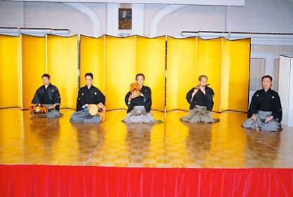 いよいよ昭和53年卒の吉阪一郎氏率いる、能楽五人囃子の登場です。楽器紹介、謡と囃子の説明、舞の説明などを取り入れながら、「早苗」「小督」「乱」の3曲を演じていただきました。大変緊張感のあるすばらしい舞台でした。30分ほどの時間でしたが、年齢、世代に関わらず、伝統芸能の世界を間近に感じることができ、大変好評でした。