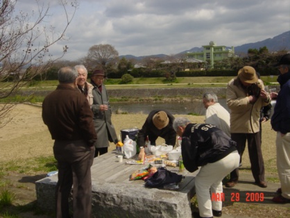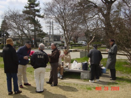 桜の開花が3月24日と早かったので、開催日を3月30日(日)と1週間前倒ししました。予定を変更したこともあって、3月30日(日)に集まったのは十人と少し淋しい出席状態でした。10時から記念碑を清め、周辺の草を引く作業を行いました。そのあと日露戦争のまっただ中、真下飛泉先生の作になる「出征」が附属小学校の学芸会で初めて歌われたという話を聴き、いよいよ持ち寄った飲み物・肴で一献と相成りました。今年は、碑の近くに水道の蛇口が付いたり、木製のしゃれたベンチが設置されたりと、環境は至って良くなっておりました。しばらくして、空からポツポツ冷たいものが落ちてきたので11時半ころ解散しました。