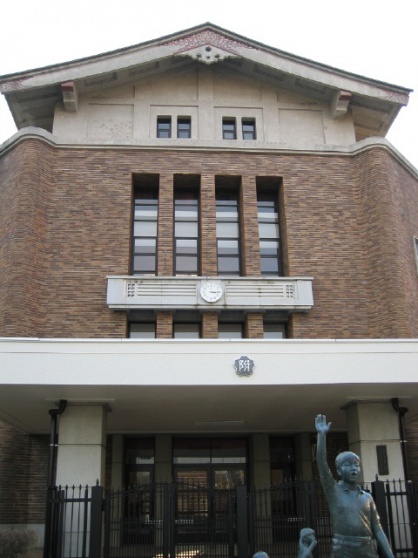 昭和13年に竣工した母校校舎は、洋館なのに正面塔屋上部が切妻風になっています。よく似た建造物に、鴨沂高校(元府立一女)、古屋市役所などがありますが、当時の建築の先端を行くものとして価値の高いものと考えられます。この切妻部には唐草文様の破風飾りが取り付けられていたのですが、永年の間に落下し、ずっとそのまま放置されていました。いつか復元新しなければと思いつつ、機会に恵まれませんでした。今回の母校校舎の改修工事にあたり、正面塔屋の棟部まで足場が組まれた機会をとらえ,同窓会としてこの「破風飾り」を復元しようということになり、松重さんに製作を依頼し、岡野組さんに取り付け工事をお願いしました。母校の近くをお通りの節は是非正面塔屋の切り妻部の「破風飾り」を見上げていただきたいと思います。